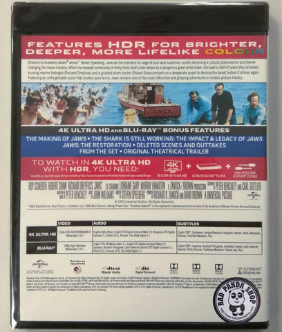 In 1975, director Steven Spielberg brought Peter Benchley's best-selling novel to the screen with stunning power and unbearable suspense, leaving an indelible mark upon the movie-going (and beach-going) public. Starring Roy Scheider, Robert Shaw and Richard Dreyfuss as the men who must destroy the three tons of instant white death that terrorises a small holiday resort, JAWS became one of the greatest box-office attractions in motion picture history as well as an all-time cinema classic.