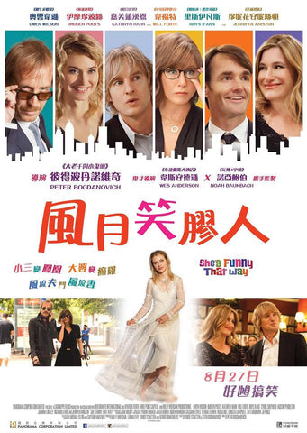 From renowned director Peter Bogdanovich, SHE'S FUNNY THAT WAY is a screwball comedy featuring the interconnected personal lives of the cast and crew of a Broadway production. When established director Arnold Albertson (Owen Wilson) casts his call girl-turned-actress Isabella "Izzy" Patterson (Imogen Poots) in a new play to star alongside his wife Delta (Kathryn Hahn) and her ex-lover Seth Gilbert (Rhys Ifans), a zany love tangle forms with hilarious twists. Jennifer Aniston plays Izzy's therapist Jane, who is consumed with her own failing relationship with Arnold's playwright Joshua Fleet (Will Forte), who is also developing a crush on Izzy.